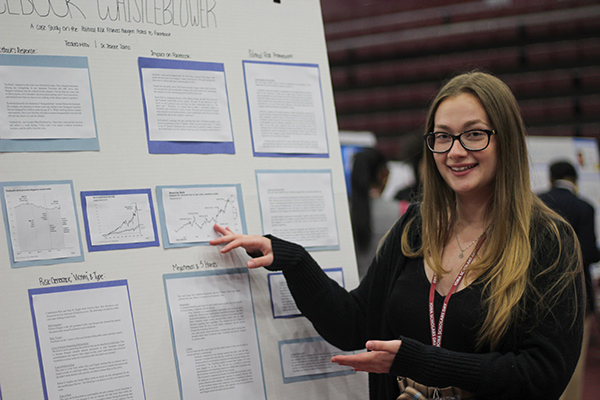 Teodora Mitov ’23, a double major in political science and media and strategic communications with a concentration in digital media and production, analyzed the political risk that Facebook faced because of the whistleblower situation in 2021 when Frances Haugen released internal documents. “Student research is an amazing thing we have at Iona and it’s great that we get to see what other people are working on. Iona Scholars Day allows us to see everyone’s research and also present our own, which is very fun.”