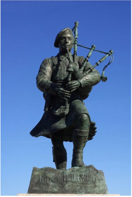 Millin was born in Canada on July 14, 1922, but his family moved back to Scotland when he was three. Having volunteered for military service, he found himself among the troops landing at Normandy at age 21. As the story is told, bagpipers were forbidden in combat in World War II, and when ordered to lead the troops, he cited this regulation, but his commanding officer said, “…that was from the English war office…” and didn’t apply to them. Millin stated later that talking to captured German snipers, they claimed they had avoided shooting him because they thought he had gone mad.