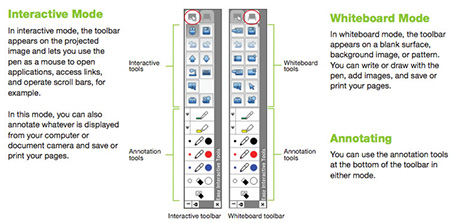 The projector contains two types of toolbars- the interactive mode toolbar and the whiteboard mode toolbar.