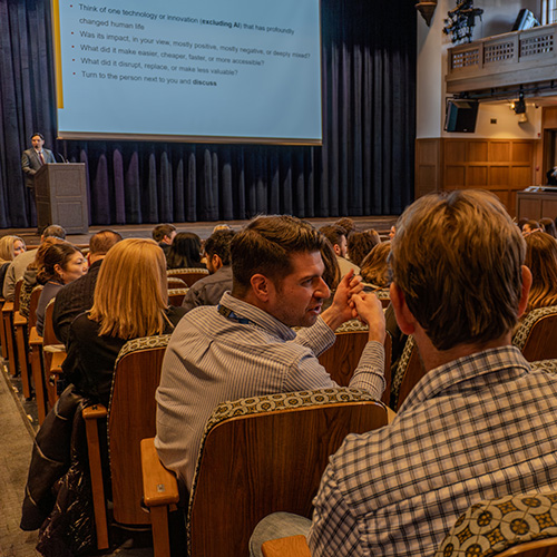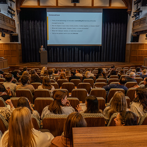 At The Bronxville School’s Superintendent’s Day on Friday, March 20, Hynes Institute for Entrepreneurship and Innovation Assistant Professor Aakash Sapru, Ph.D., invited school faculty and staff to think critically about artificial intelligence not as a force that simply happens to education, but as a tool whose impact depends on the choices educators make.