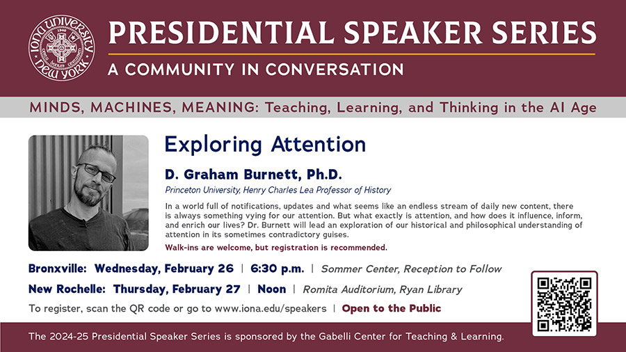 New Rochelle, N.Y. & Bronxville, N.Y. – In a digital age dominated by constant notifications and distractions, understanding the power of focused attention has never been more critical. Iona University is proud to host D. Graham Burnett, Ph.D., a distinguished scholar and leading thinker on the human dimensions of attention and its current crisis, to explore these important themes.