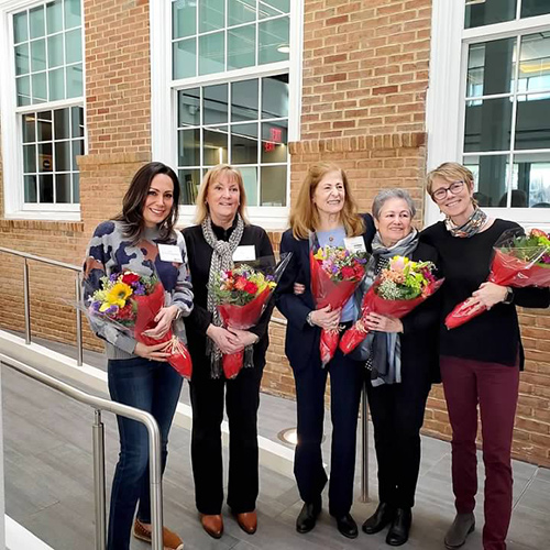 Left to right: Amy Torigian Parise ’03MST, Janice “Ghiorsi” Crowley ’76, Ruthanne “Mahoney” Boehmcke ’76, Sandie Capifali and Fran Clemente ’95.