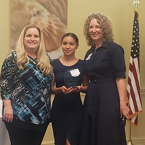 Susana Coxaj ’19, center, receives the NASW Social Work Student of the Year Award in Fort Pierce, Fla., with Avril Zamparo, MSW, Life Care Center of Port St. Lucie (left); and Kathryn McCormic, LCSW, MCAP, FAU Social Work Field Faculty.
